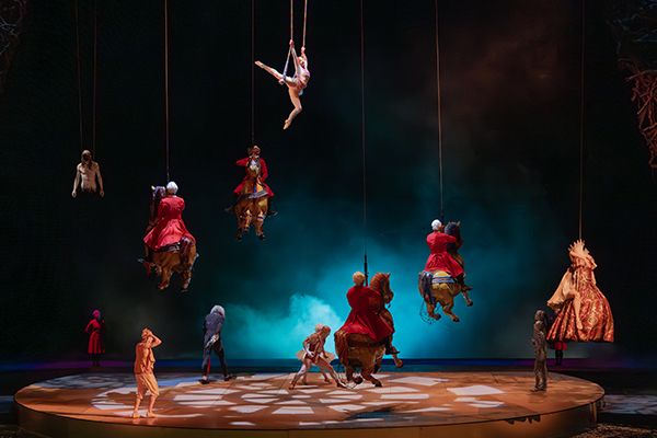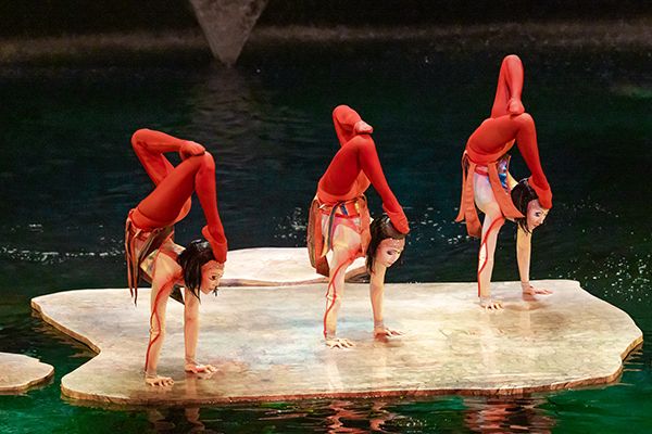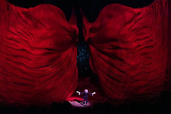 One of the first striking features about “O” is its opening curtain: a 50-foot tall, 100-foot wide rich red veil that plays a role of its own in the story.
